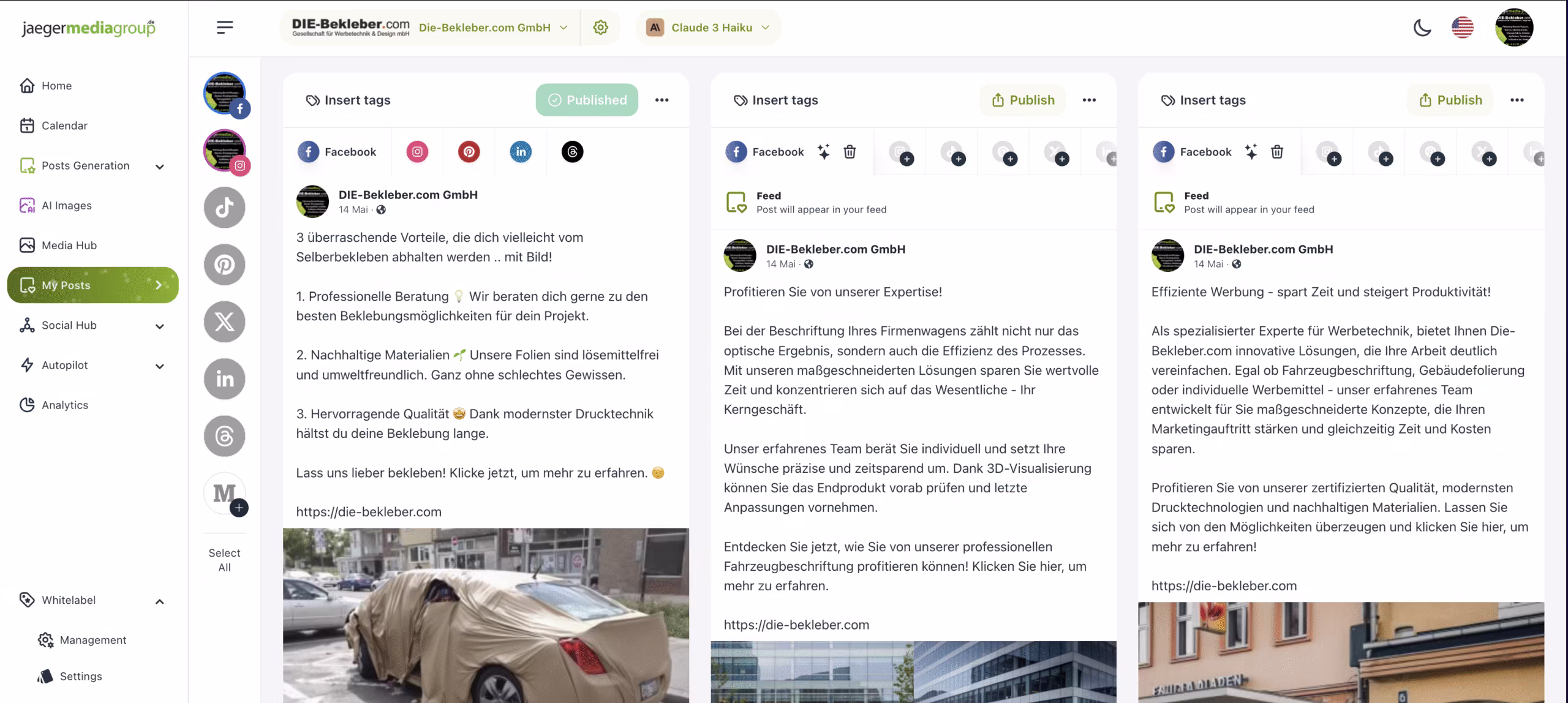 Social@ALL revolutioniert Ihre Social-Media-Posts. Die Plattform erstellt und optimiert automatisch die besten Inhalte für Ihr Business, sucht ständig nach neuen Ideen und sorgt dafür, dass Ihre Beiträge immer frisch und wirkungsvoll sind. Natürlich können Sie jederzeit Korrekturen vornehmen und anpassen.