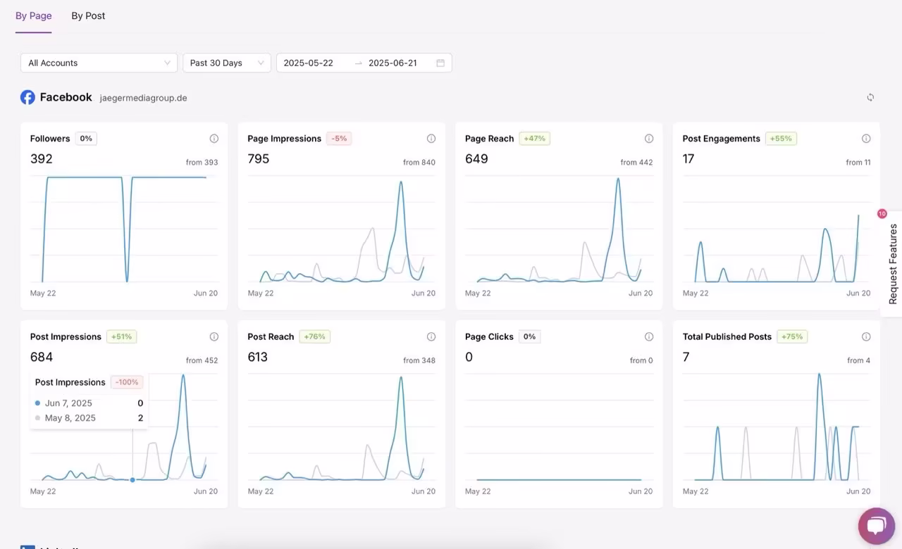 Statistiken für alle Soziale Netzwerke in der Übersicht. Geordnet und zusammengefasst. Einsicht in jeden einzelnen Post. Klicks, Impressions etc. Klicke für mehr Informationen